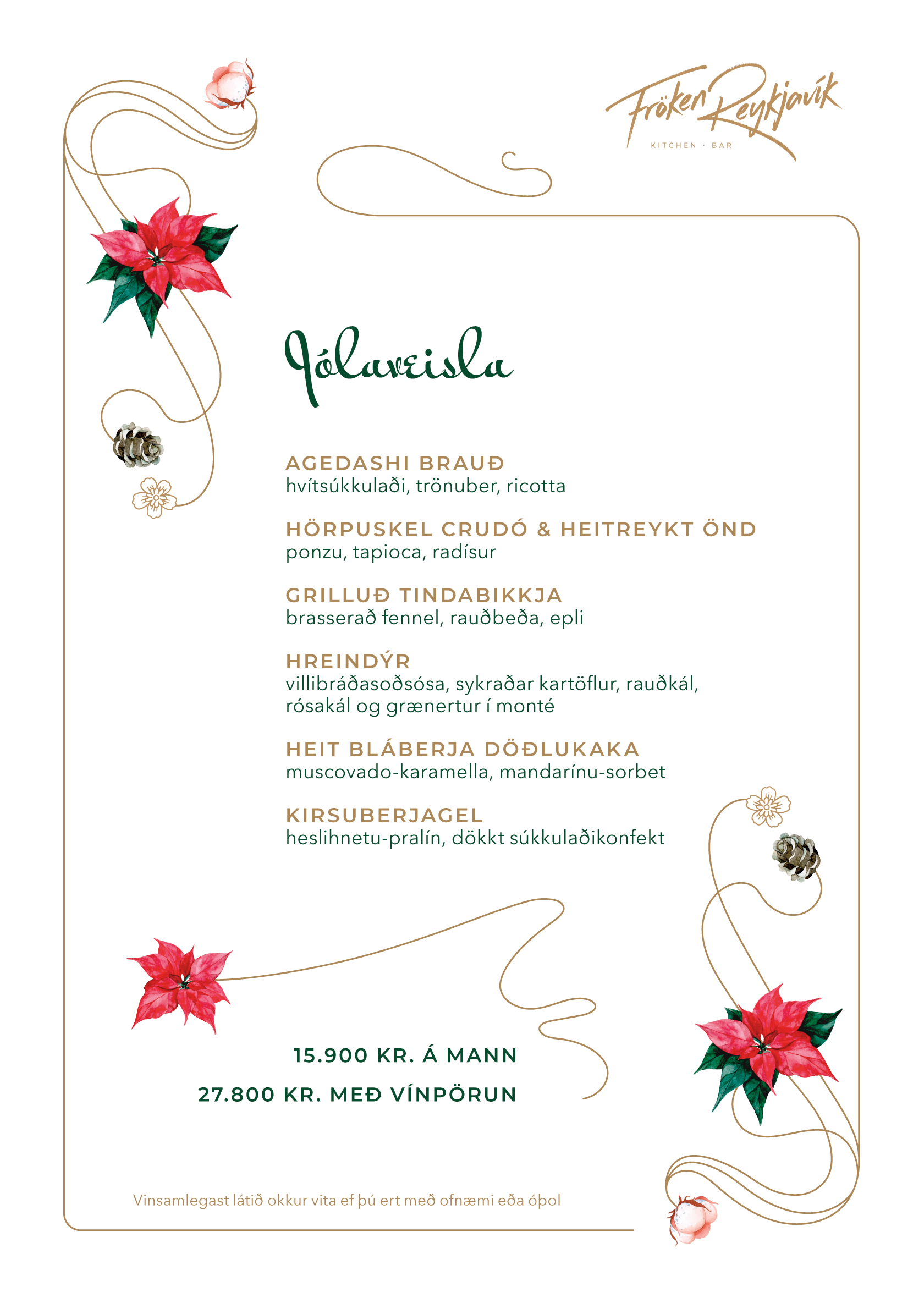 Njótið einstakrar jólaveislu á Fröken Reykjavík, þar sem hátíðlegt andrúmsloft og ljúffeng jólamáltíð fer saman. Fullkomið tækifæri til að fagna með vinum, fjölskyldu eða samstarfsfólki í einstakri umgjörð.